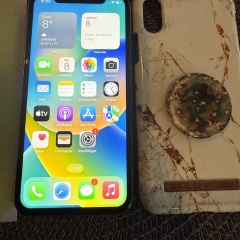 iPhone X 64g med usb ledning, deksel, og SIM-kort åpner. Ikke noen riper i skjerm og bakside. Nytt batteri 100%. Face ID fungerer ikke.