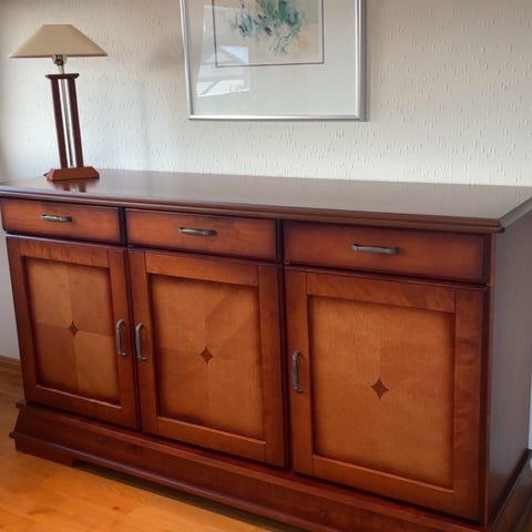 Grange, Lyon håndlaget møbel. Heltre kirsebær. Flott håndarbeid. Nydelig skjenk med hyller og tre skuffer.
