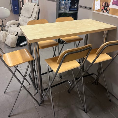 Mål på bord er 74*74 cm og 102 cm høyt. Sittehøyde på stolen er 71 cm og stolryggen er 100 cm høy. Bordet kan fungere både som skrivebord og kjøkkenbord