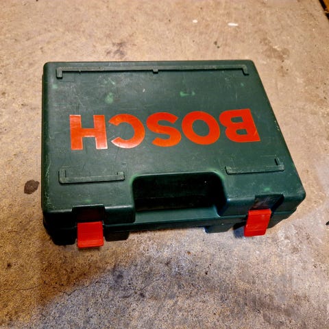 Bosch L-BOXX oppbevaringskoffert i blå plast med sort håndtak og røde låser. Designet for å organisere og transportere verktøy og tilbehør. Robust konstruksjon med låsemekanismer for sikker lukking. Passer for profesjonell og privat bruk.
