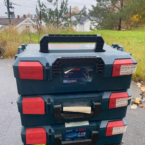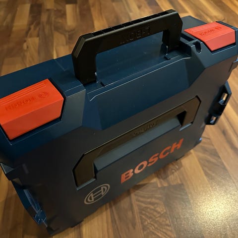 Bosch L-BOXX oppbevaringskoffert i blå plast med sort håndtak og røde låser. Designet for å organisere og transportere verktøy og tilbehør. Robust konstruksjon med låsemekanismer for sikker lukking. Passer for profesjonell og privat bruk.