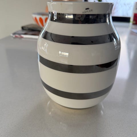 Iittala vase i keramikk med hvite og sølvfargede striper. Passer som dekorativ gjenstand i hjemmet eller kontor. Kompakt størrelse som gjør den enkel å plassere på bord eller hyller.