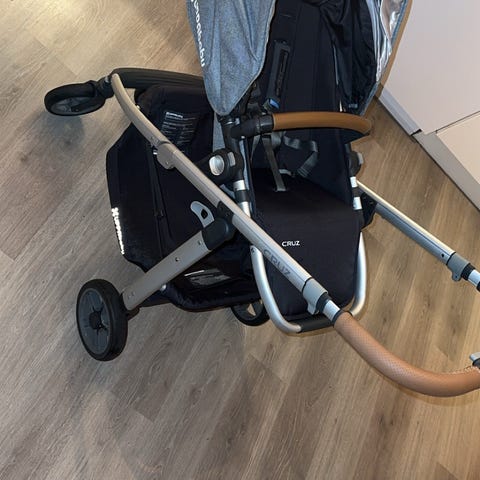 UPPAbaby Cruz barnevogn med grønn og grå fargekombinasjon. Passer for barn og har justerbart sete med solskjerm. Utstyrt med fire hjul og oppbevaringskurv under setet. Ramme i metall med polstret håndtak.