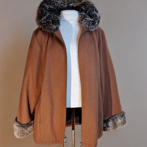 Som ny, da den er ybetydelig brukt! Veldig varm og god classy Ull og med ekte pels krave og lue til i brunt. Norsk, gamle Oslo design medjakke fra Per Manvik Oslo, og ekte matchende pels lue fra buntmaker Rolf Kristiansen Norway. Föret av /med ekte varm og god pels! Skikkelig kvalitet og varm og god ull med spenner!