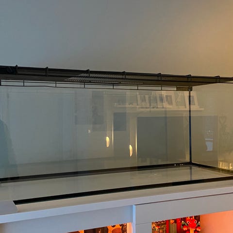 Glassbur ( detolf ) fra IKEA. Dette buret er perfekt for hamster eller andre små gnagere. Det er god plass i buret for dyret til å løpe på. Vi har lagt trådhyller som lokk på buret.