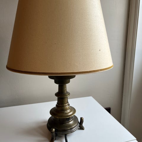 Flott bordlampe i messing , lampeskjermen følger med. Eldre støpsel. Søkeord: vintage,retro,stue,interiør,diverse,belysning,lampe,bordlampe,dekor,dekorasjon,hytte, Kan sendes med postnord for 69kr H:30 cm .