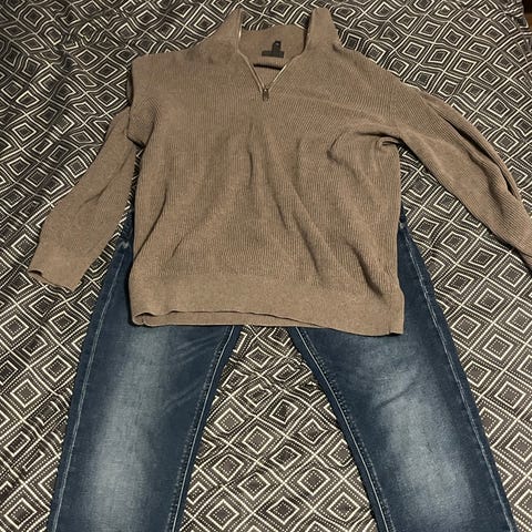 Dressmann genser for menn i størrelse S, farget grå. Genseren har en enkel design med ribbestrikkede kanter på ermer og nederkant. Materialet er ikke spesifisert, men genseren har en vanlig passform og langermet design.
