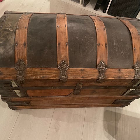 Antikk tre kiste med dekorative malte mønstre og metallbeslag fra 1711. Kisten har et hengslet lokk med innvendig grønnfarget interiør. Dato og initialer er skrevet på innsiden av lokket, som indikerer alder og opprinnelse. Kisten er laget av tre og metall, og kan brukes til lagring eller som dekorativt møbel.