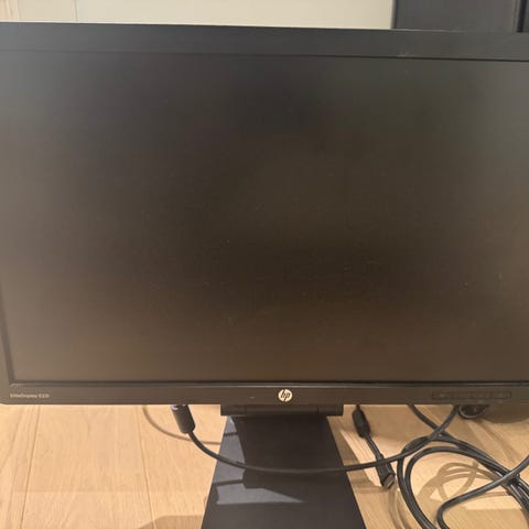 HP EliteDisplay E232 23-tommers skjerm med justerbar stativ, svart og sølvfarget design. Skjermen har en størrelse på 23 tommer og leveres med tilhørende kabler for tilkobling.
