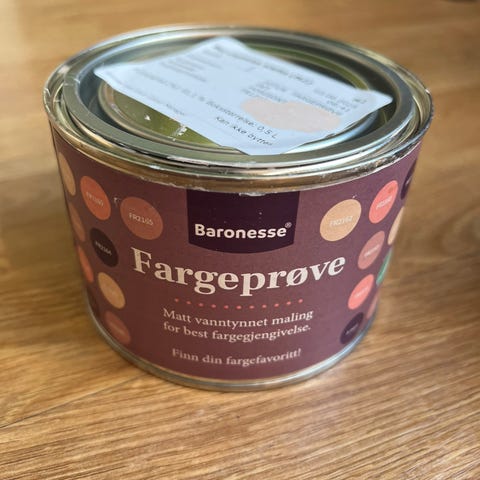 Fargeprøve i fargen Deco Pink, i malingen Baronette til Fargerike. 0,5 liter. Så en halv liter.