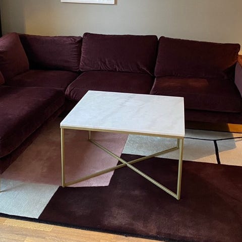 Solid bord i ekte marmor med stålunderstell (sølvfarget). Kan slipes og impregneres