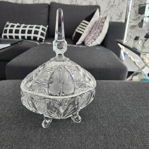 Stor krystallskål med lokk, med dekorative, innskårne mønstre. Skålen har en rund form med fot og et avtagbart lokk med spiss topp. Passer til oppbevaring av små gjenstander eller som dekorativt element.