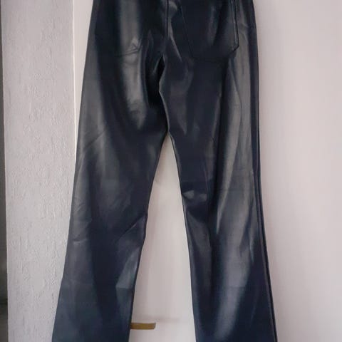 Bik Bok bukser i beige farge, størrelse 36 for kvinner. Skinnbukse-look med glidelås i siden. Bukser med rett passform og «slengbukse»-effekt nederst på bena. Laget av et materiale som gir en tøff passform.