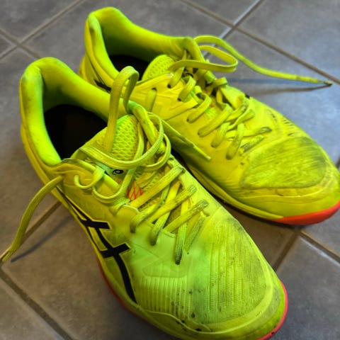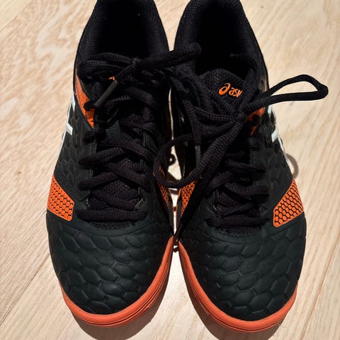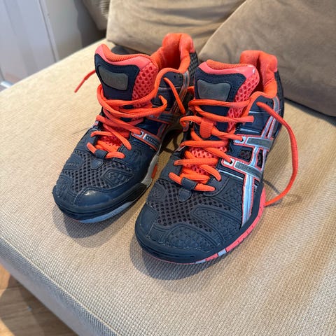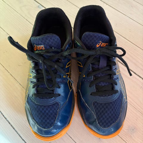 Asics Gel Rocket 9 innendørs treningssko i blå og gul farge, størrelse 40,5. Skoene har mesh øvre materiale for pusteevne og gummisåle for godt grep på innendørsflater. Egnet for sport og trening innendørs.