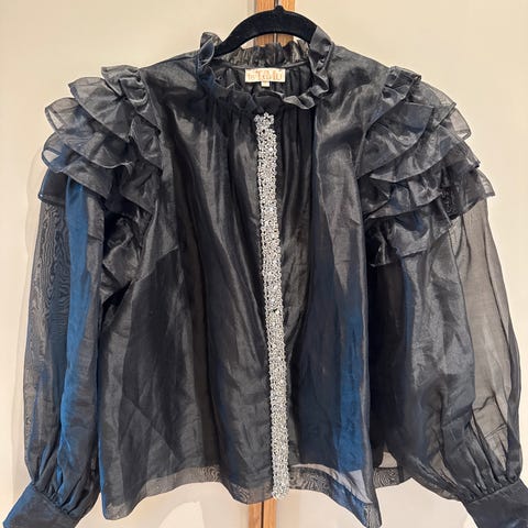 byTiMo Bluse i svart farge, størrelse XS. Blusen har volangdetaljer på skuldrene og mansjetter med knapper. Den har en dekorativ front med perlebesetning. Materialet har en lett glans og kan brukes åpen som en jakke også. Litt stor i str.
