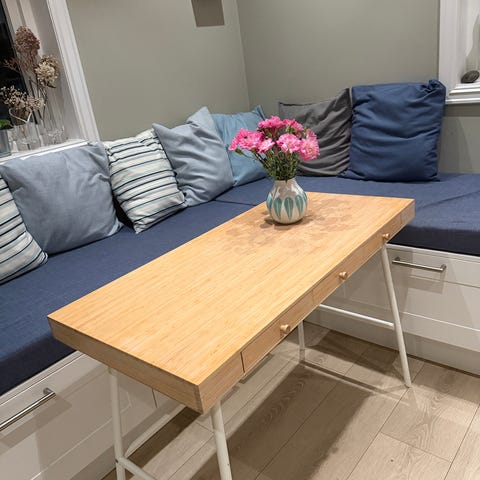 Nydelig gammelt blått salongbord/ kiste med oppbevaring. Malt i lys gråblå farge og lokk / bordplate med fin patina. Passer fint feks til sommerhytta eller der man trenger bord med oppbevaring. Selges kr 2750