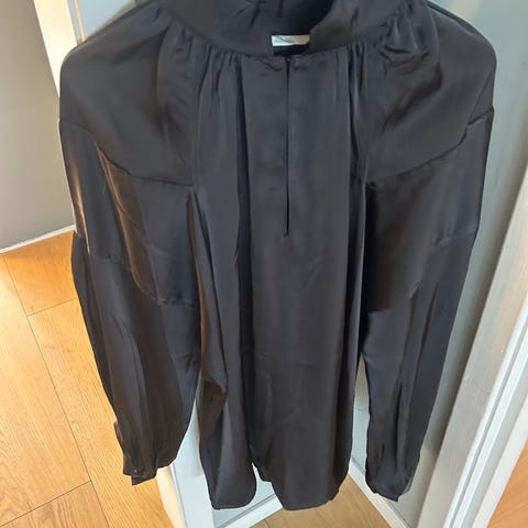 Brukt kun 1 gang, Malene Birger Leonora satin shirt. Veldig fine detaljer på ermer og rygg. Skjorten er str 36, men er oversized og kan nok brukes av str 36-40 , alt etter hvordan man ønsker den skal sitte.