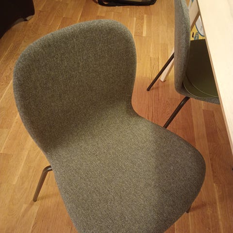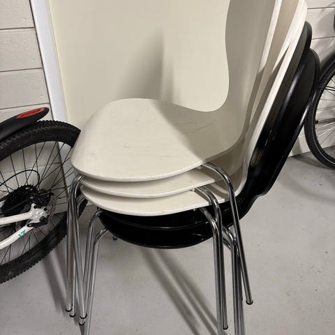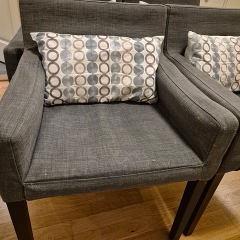 Pent brukte stoler med beige trekk over selges. 200 kr stk.Har 8 stoler.