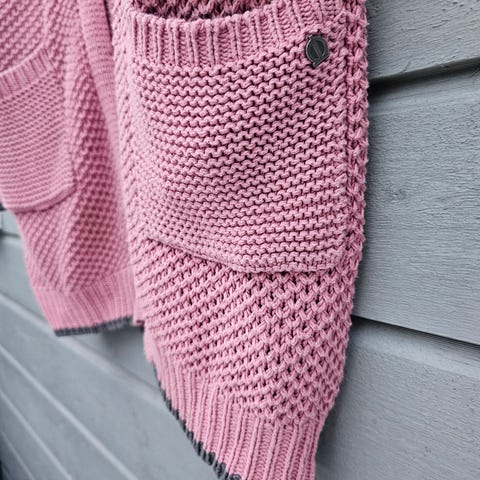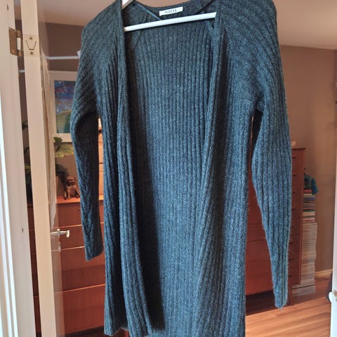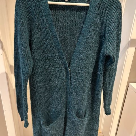 Grønn strikket cardigan for dame i størrelse S. Cardiganen har knappelukking foran, to lommer og er strikket i deili alpakka. Ermet er langt, og plagget har en enkel og funksjonell design.
