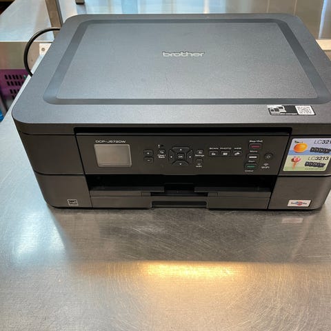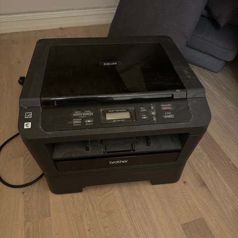Brother DCP-L2530DW multifunksjonsskriver med utskrifts-, kopierings- og skannefunksjoner. Enheten har en kompakt svart design og inkluderer nødvendige kabler for tilkobling. Passer for hjemme- eller kontorbruk med trådløs og kablet tilkobling.