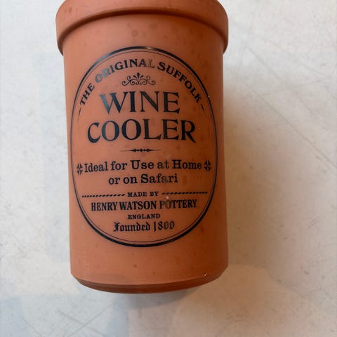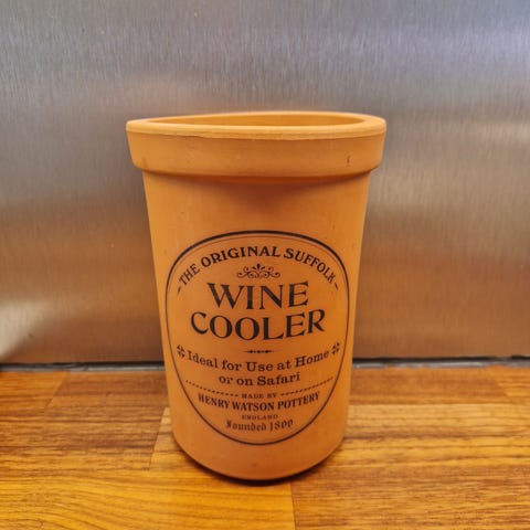 Til salgs: en vinkanne i brent leire, solid laget og massiv. Settet inkluderer en SUPER CHEF serviettdekorasjon.