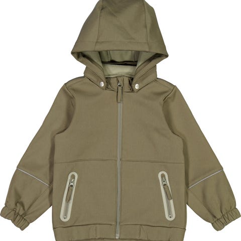 Wheat softshelljakke med bukser størrelse 128, designet for jenter. Settet består av jakke med hette og bukse . Jakken har glidelås og lommer med glidelås. Materialet er vannavstøtende, egnet for bruk i vått vær.