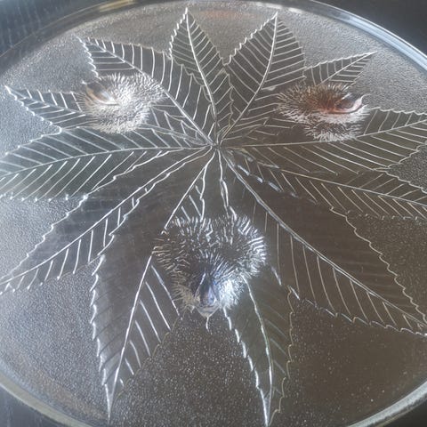Flott glassfat i klart glass med dekorative mønstre. Litt oval form med teksturert overflate som gir et unikt uttrykk. Passer til servering eller som dekorativ gjenstand. Er 30,5 x23cm.