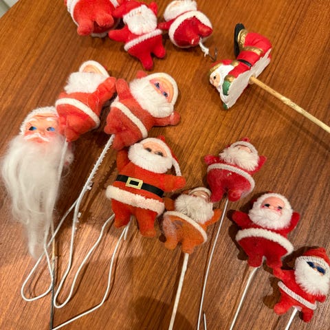 Pris under hvert bilde. Fine nisser med klær . Kan sende med post nord kr 69 eller liten pakke avhengig av størrelsen.Høyde nissefar ca 31cm. De 2 andre er ca 26 og 28cm høy.