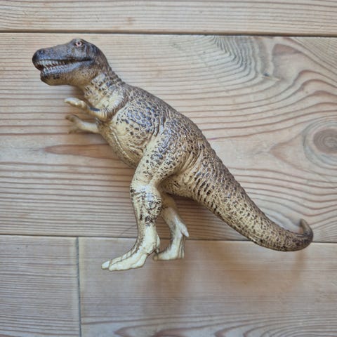 Selger en Liewood dinosaur i silikon, farge dus rosa. Aldri brukt. Har en naturlig patina look i overflaten slik bildene viser.
