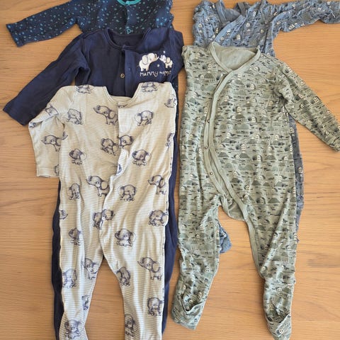Et utvalg av barneklær for gutter i størrelse 68, inkludert forskjellige plagg som bodyer, gensere og bukser. Egnet for små barn.
