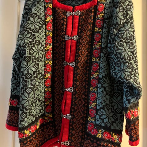 Dale of Norway Cardigan i størrelse S for kvinner. Cardiganen har en rød farge med tradisjonelt norsk mønster og detaljer i svart og oransje. Laget av ullmateriale, egnet for bruk i kaldere vær. Cardiganen har knappelukking foran og lange ermer.