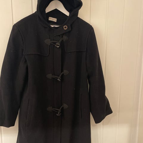 Max Mara Max&Co duffle coat / car coat kåpe med hette i svart farge, størrelse 40. Passer som S, M og L pga A-silhuett. Kåpen har et klassisk tidløst design med hette, to lommer foran og knappelukking. Materialet er mykt ren «børstet» ull og har en glatt innerforing for komfort. Ingen hull eller flekker, normal slitasje, fremstår som lite brukt.
