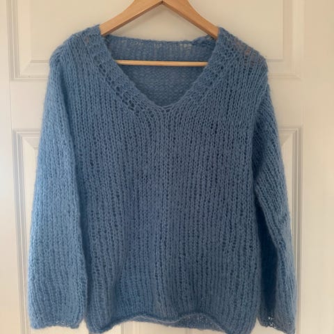 Ny hjemmestrikket genser. Strikket i 71% Alpakka, 25% Ull og 4% Polyamide, som gir en fin Mohair effekt.