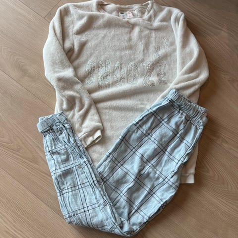 Joggebukse fra Newbie, t-skjorte fra Gant og en hjemmestrikket bomullsgenser i str.116 selges for 150kr.