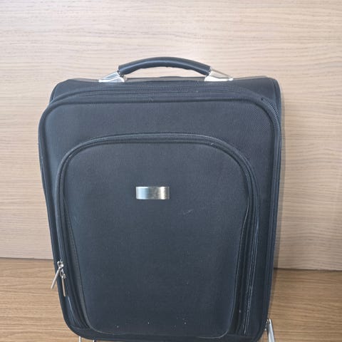 Solid stor koffert,som står for en støyt. Store hjul,lett å trille. Noen bruksmerker utenpå. Mangler to hemper inni. Se bilde. Kodelås,nøkler og to kleshengere følger med. Mål: 80x57x28. Vekt ca 6,5 kg.