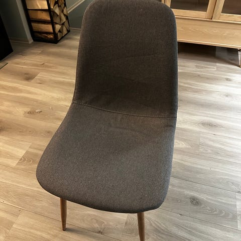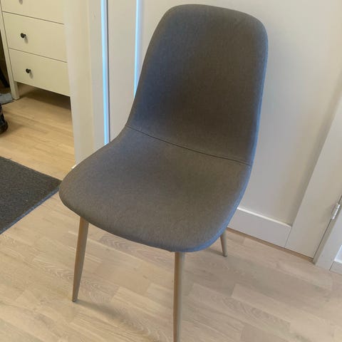 Sete med polstret sete og rygg i grått stoff. Stolen har ben i eikefarget stål. Sete har en høyde på 46 cm.