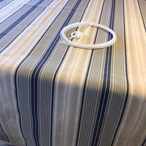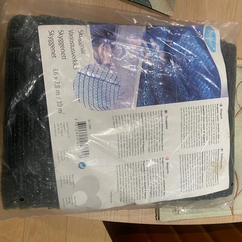 Isabella Schaduwdoek 3,6 meter i størrelse, inkludert opphengsutstyr bestående av kroker, karabinkrok, og strammeinnretninger. Produktet er laget for å gi skygge og beskyttelse mot solen, egnet for utendørs bruk, tåler regn.
