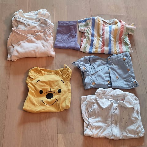 Blandet merker barneklær for gutt i størrelse 74. Inneholder ulike plagg i flerfarget design, inkludert bodyer, t-skjorter, bukser og shorts. Materialene varierer, med hovedsakelig bomull og denim. Passer for små barn i denne størrelsen.