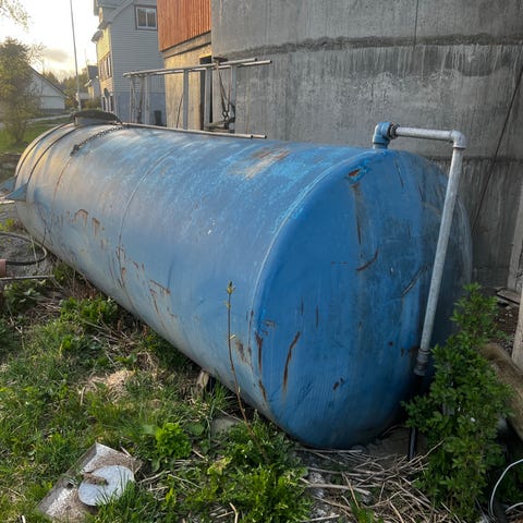 1000 liters tank. Har stått lagra i låve fleire år. Tidlegare brukt til vatn. Hentast i Kjødepollen.