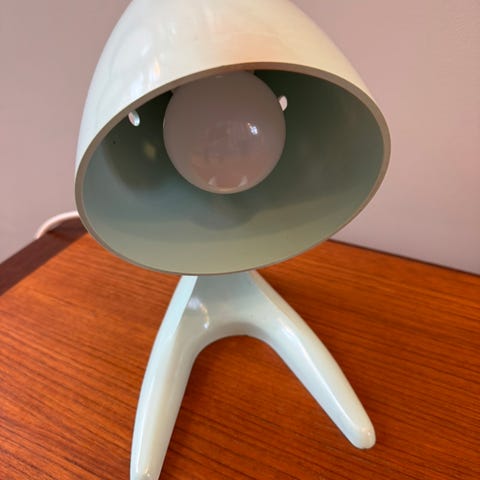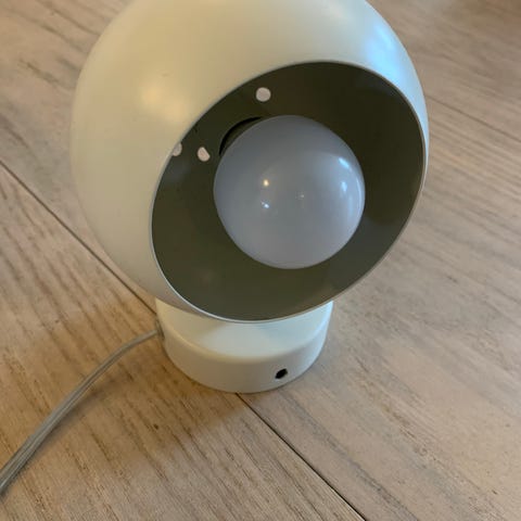 Stilig og gøyal lampe fra A/S Lyfa (dansk design) fra 1970-tallet. Magnet som gjør at man kan ta av kulen, ha den hengende, flytte den rundt på sokkelen etter behov. Bruksmerker på utsiden av kuppelen/kulen. Kan henges på veggen, eller ha den stående på et bord / nattbord.
