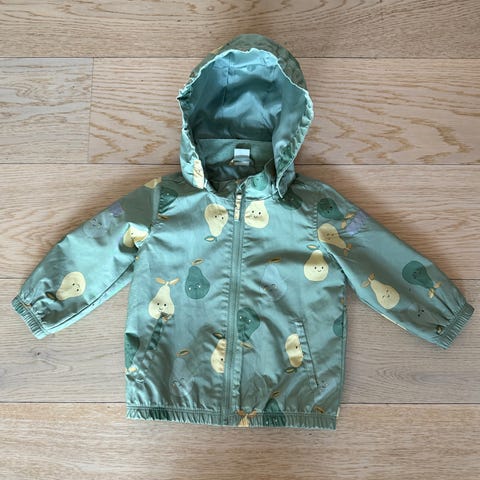 Lindex barnejakke i størrelse 86, unisex design med grønn farge og mønster med pærer. Jakken har hette og glidelås foran.