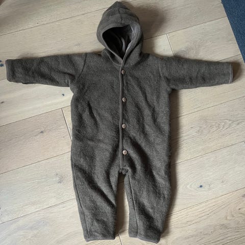 Koselig, ribbestrikket jumpsuit i myk ull med knappelukking og brettede erme- og benavslutninger.