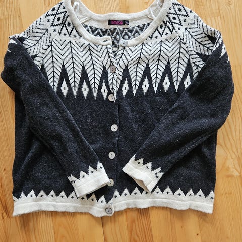 Cardigan som passer xxl / xl i svart og hvit geometrisk mønster. Akryl. En knapp oppe. Noen løse tråder så selges billig. 🍀