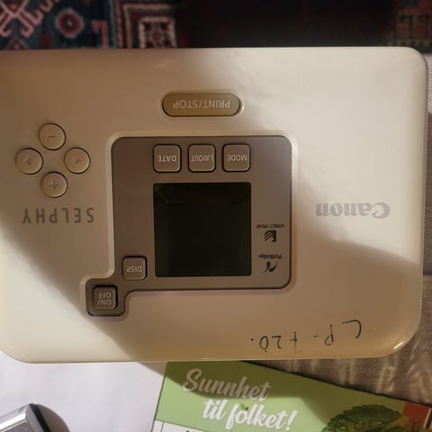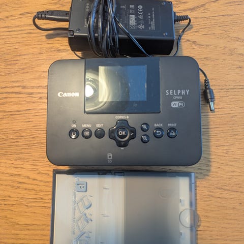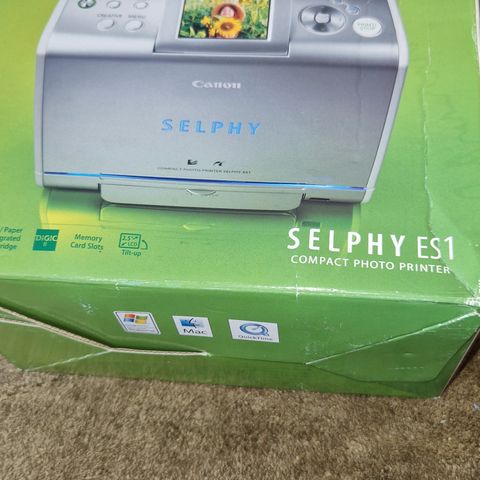 Nesten ubrukt fotoprinter som kan koples til fotoapparat. Flere blekkpatroner og noe papir følger med .
