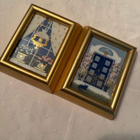 Rosendahl tre bilderammer med trekantet oppsett, gullfarget ramme, laget av tre. Passer for bilder i mindre format, designet for veggmontering eller bordplassering.