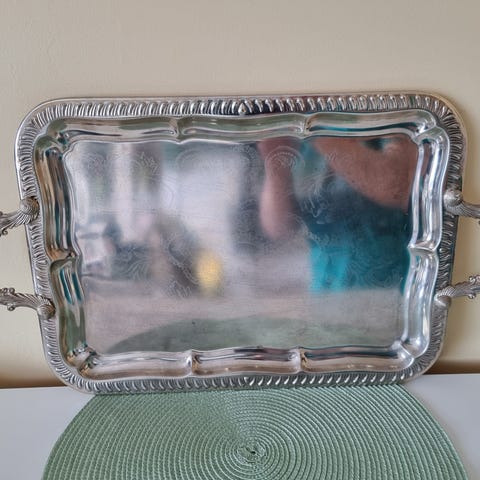 Dekorativt fat, mål; cirka 35 cm i lengde og 27 cm i bredde. Har dekorative kanter og to håndtak. Fint som lysfat på bordet 🤩