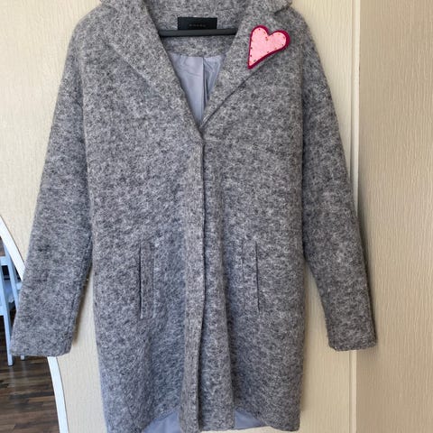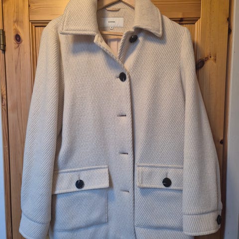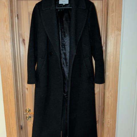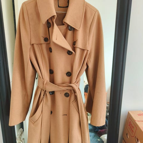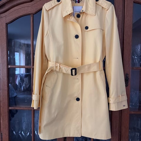 Donna kåpe i størrelse 38 (M), sennepsgul. Kåpen har dobbelspent knappelukking og belte i livet.