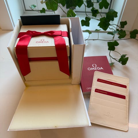 Har denne Omega klokkeholder hvis noen kunne være interessert, det følger med eske og pose.