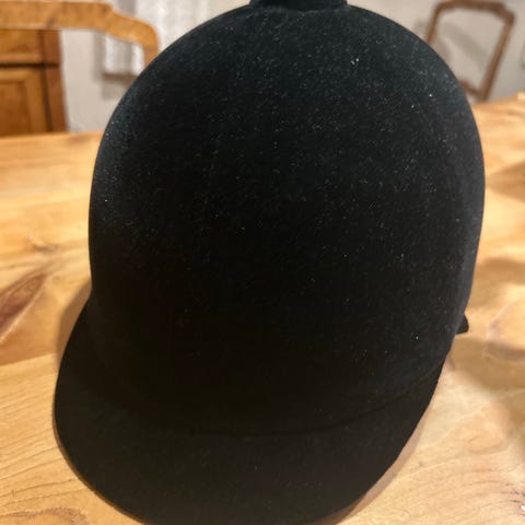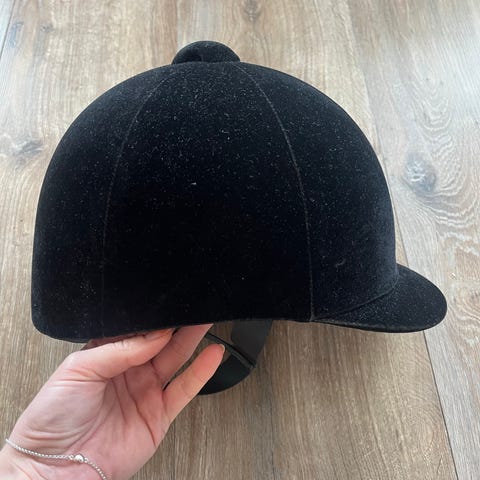 Heimer Ridehjelm med svart velour. Hjelmen har en klassisk design med justerbar stropp under haken for sikker passform. Innvendig foret med rødt stoff og merket med CE-standard for sikkerhet. Passer til bruk ved ridning.