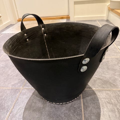 metall bålkurv i svart farge. Rund form med hullmønster langs sidene og to håndtak med ringer. Egnet for oppbevaring av ved. Solid konstruksjon med synlige bruksmerker. Kjøpt på maxbo.